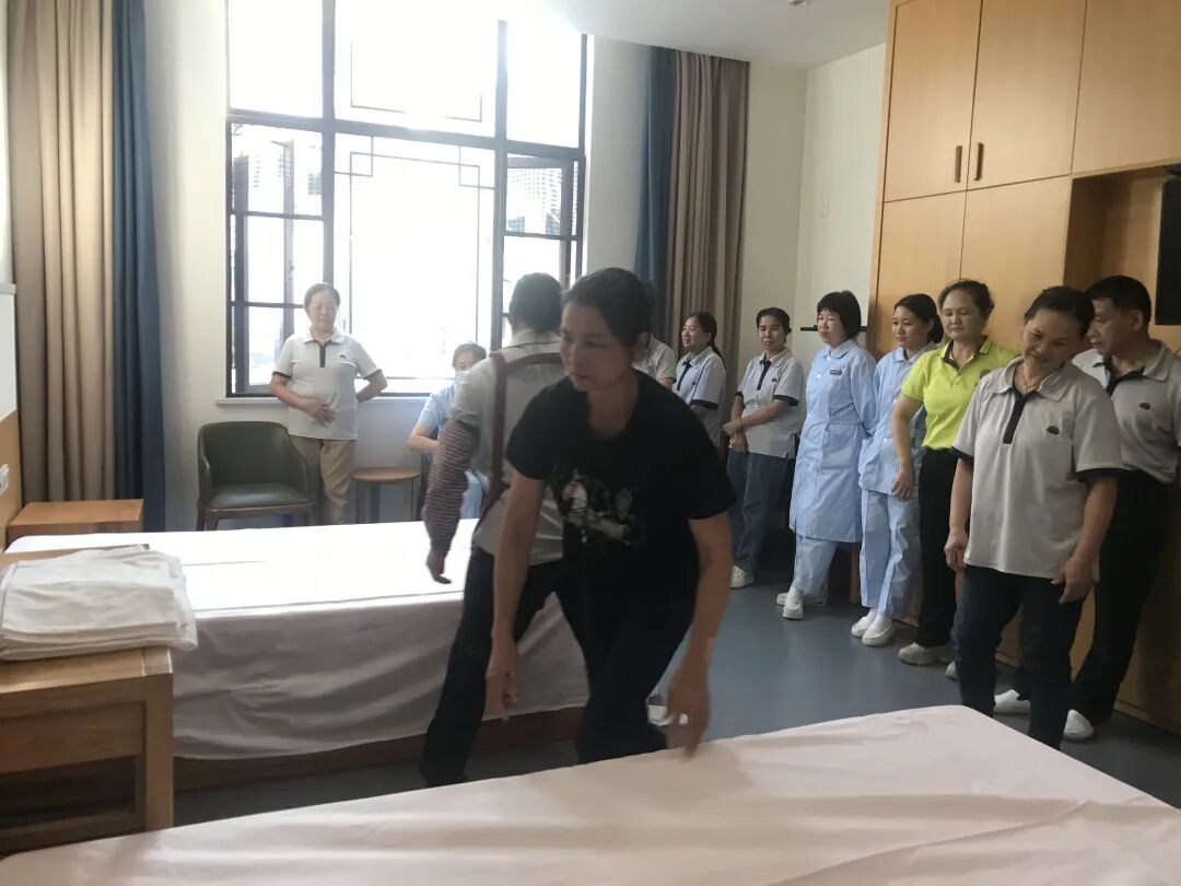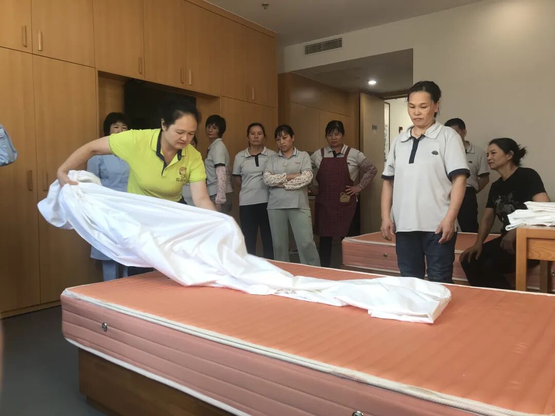 理论讲解结束后,培训随即转入实操演练阶段。全体护理人员前往客房,在讲师的现场指导下开展实战操作。“快、静、齐”铺床单技巧演示中,讲师手把手传授折叠、定位、拉伸的关键动作,要求大家在提升效率的同时,保持操作轻柔,避免影响长者休息;快速套被子环节,从被芯与被套的精准对齐到高效整理平整,每一个步骤都经过反复打磨,护理人员们认真模仿、相互交流,现场学习氛围浓厚。大家纷纷表示,这样的实操教学针对性强、实用性高,能直接应用到日常护理工作中。