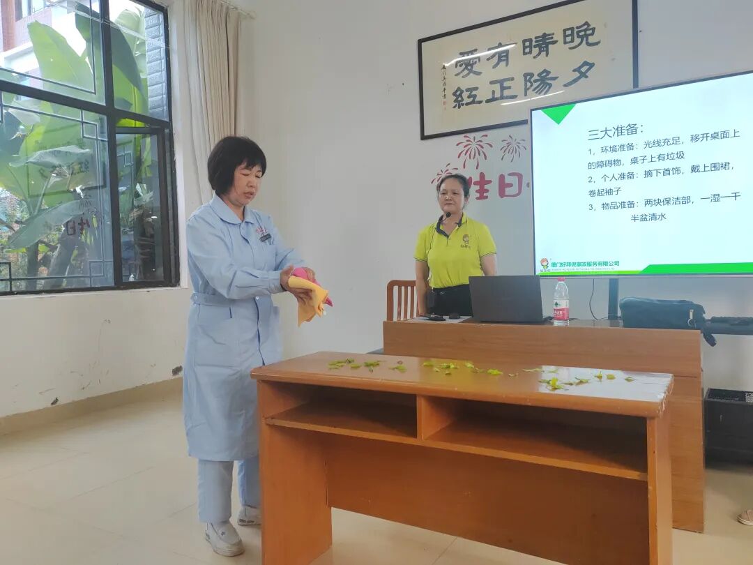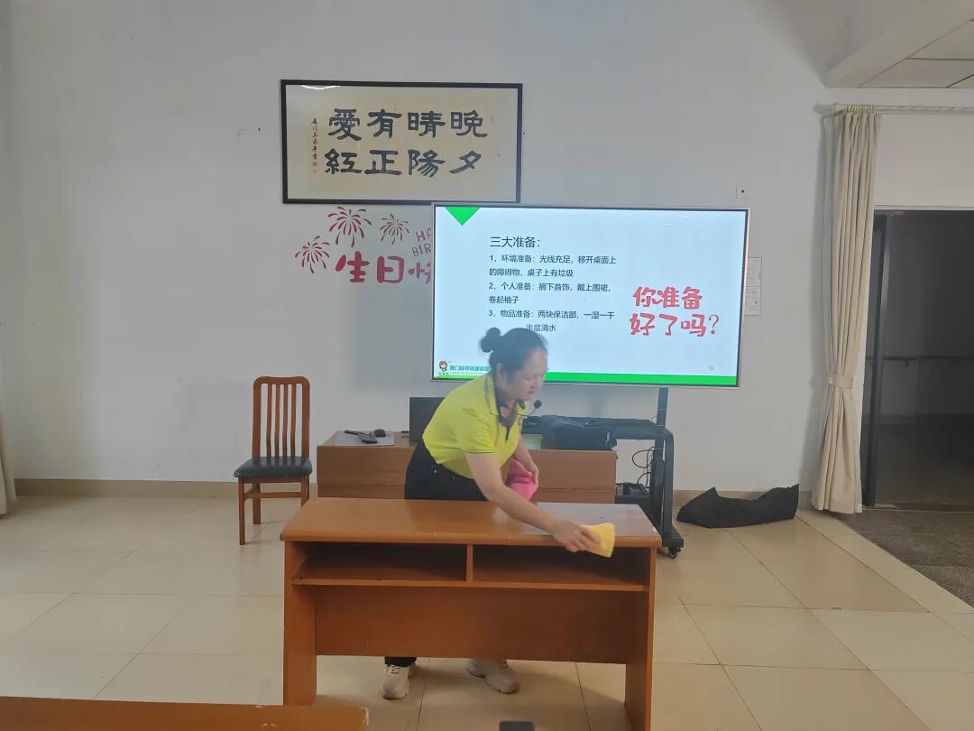 课堂上,讲师围绕长者生活场景的实际需求,将“整理收纳断舍离”“桌面规范擦拭”“抹布正确使用”等核心技能作为培训重点。在整理收纳环节,讲师结合长者居住空间特点,讲解如何通过科学分类、合理取舍,为长者打造整洁有序的居住环境,既减少安全隐患,又能让长者在熟悉的物品环绕中获得心理慰藉;桌面擦拭教学中,从擦拭顺序、力度控制到清洁标准,讲师进行细致示范,强调“无死角、无残留、不扬尘”的服务原则;针对抹布使用这一易被忽视的细节,讲师明确了不同区域抹布的分类标识、清洁消毒流程,从源头杜绝交叉感染风险,为长者健康筑牢防线。